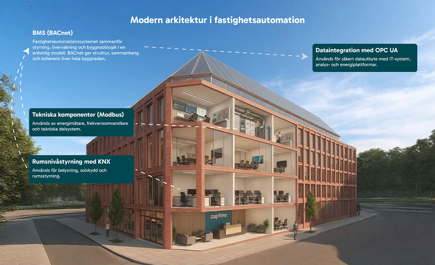Zaphire fastighetsautomationssystem är utvecklat med utgångspunkt i hur moderna byggnader faktiskt används. I stället för att förutsätta ett enda protokoll eller tekniskt system tar arkitekturen höjd för att fastigheter består av både nya och befintliga installationer, levererade över tid och baserade på olika teknologier.
